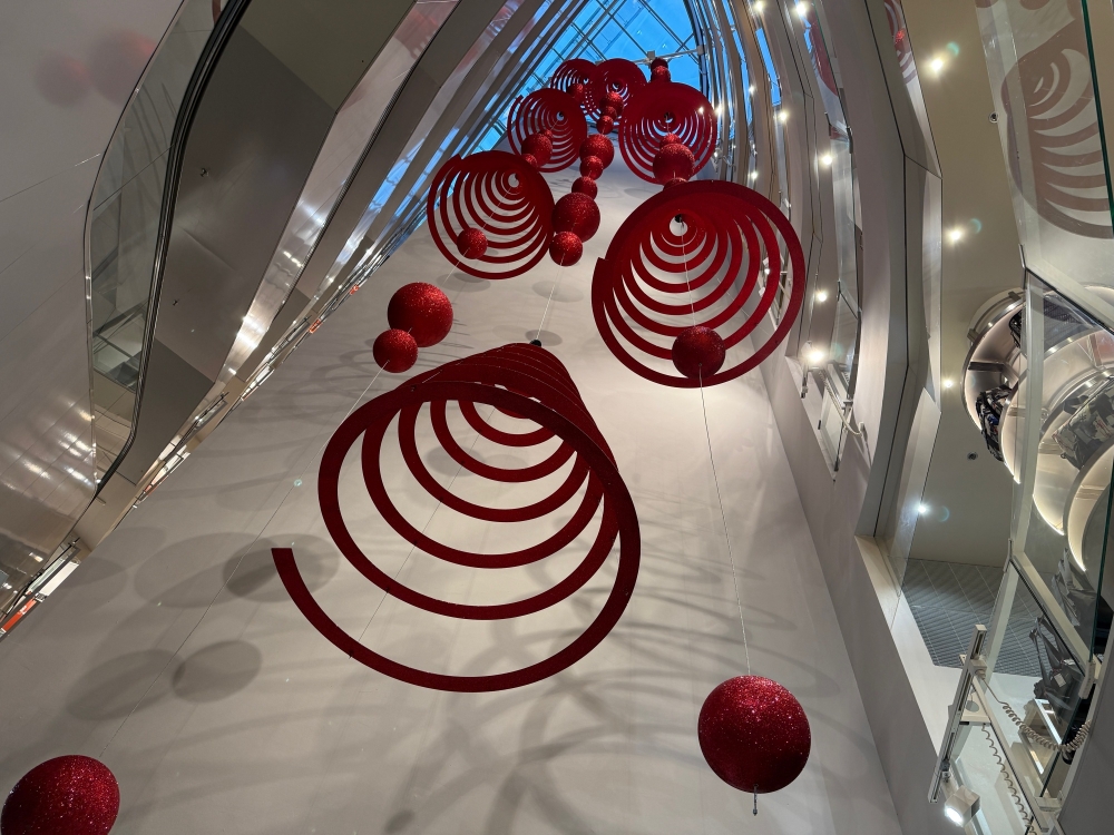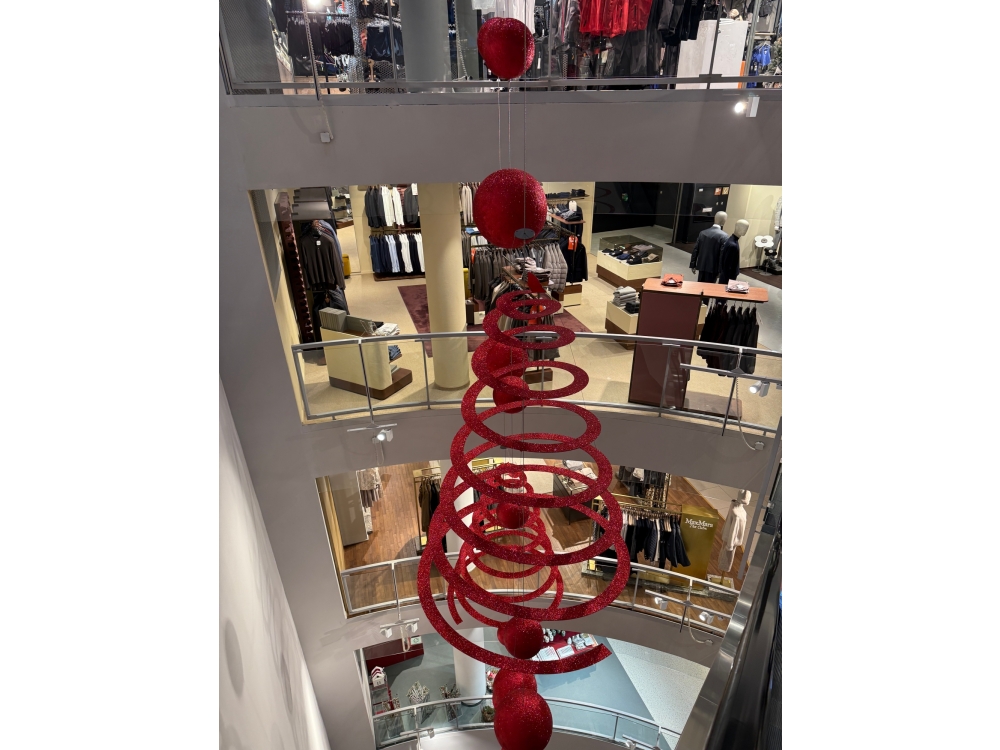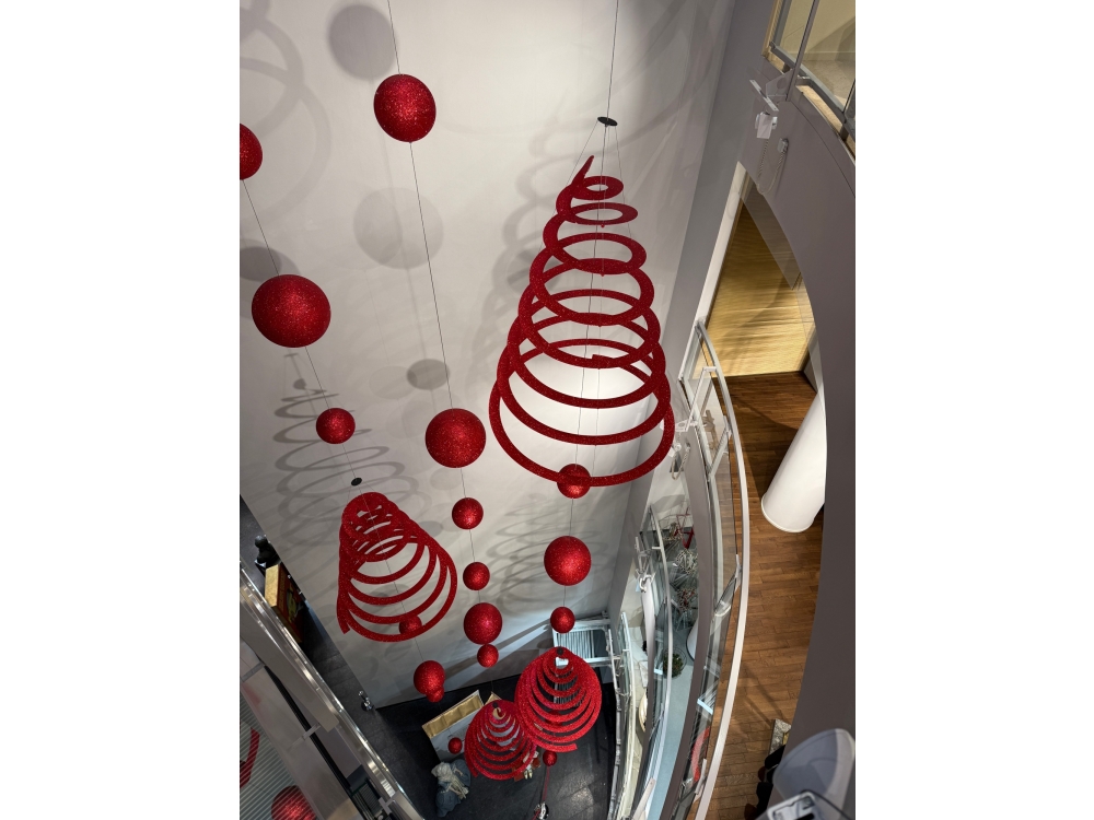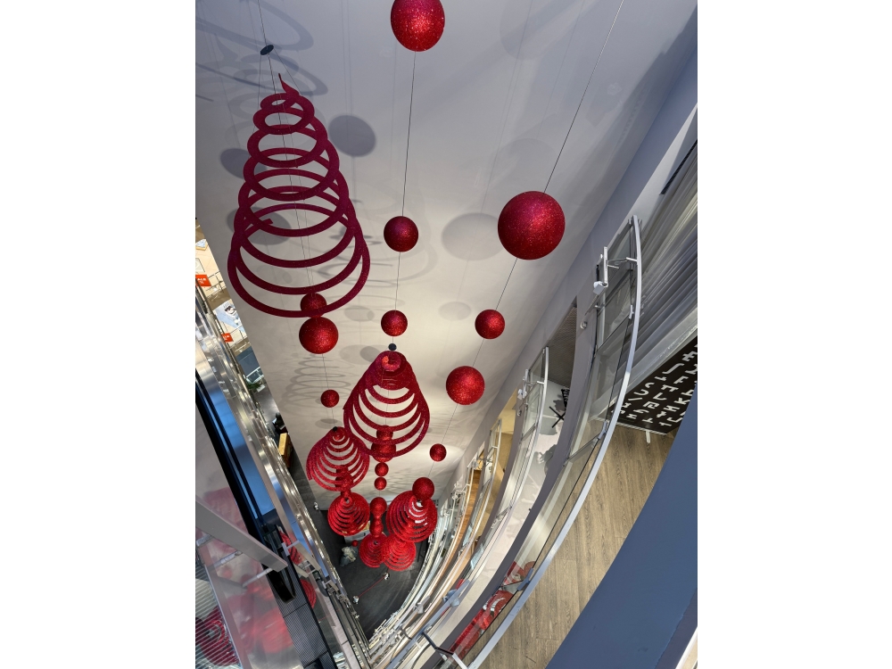 Fliegende bzw. hängende Weihnachtsdekoration im Atrium des STEFFL Kaufhauses:
